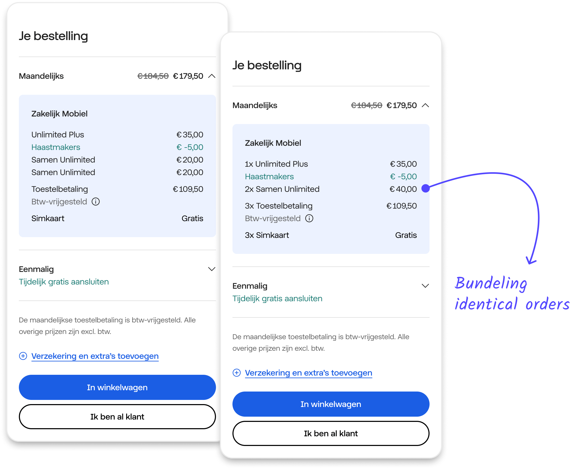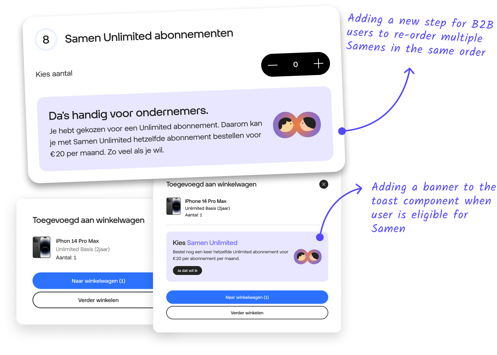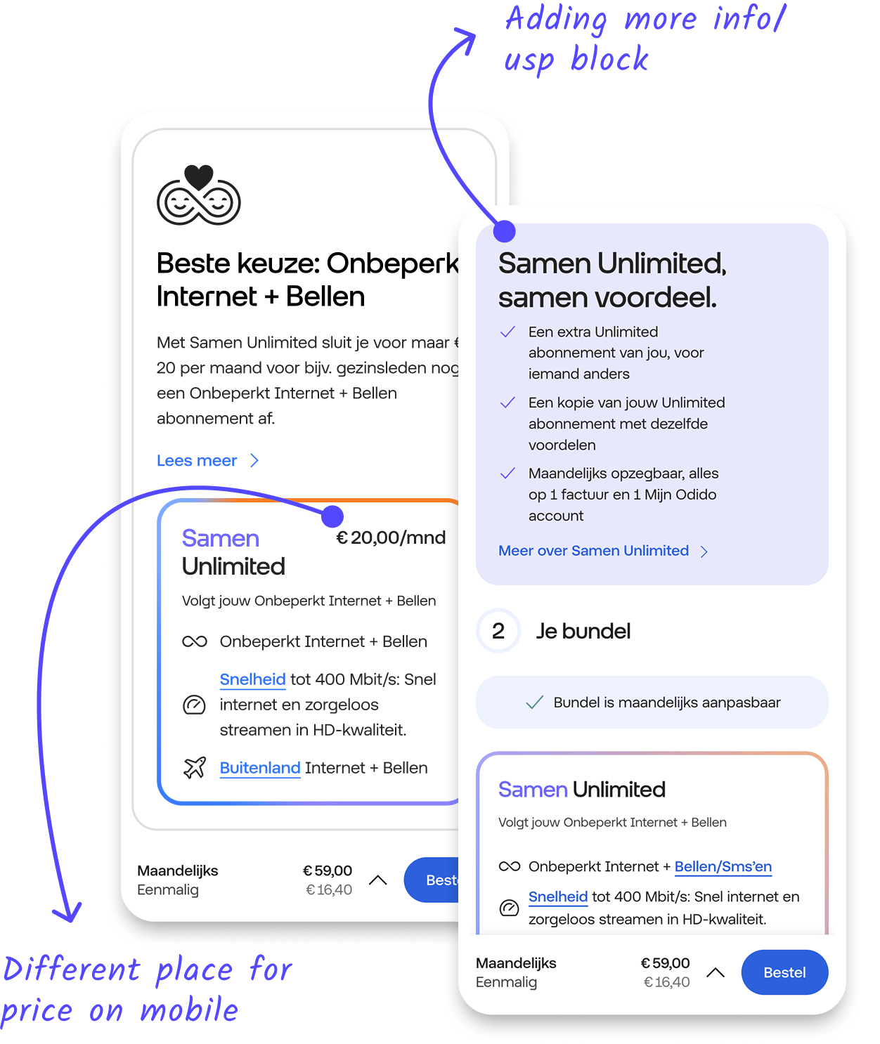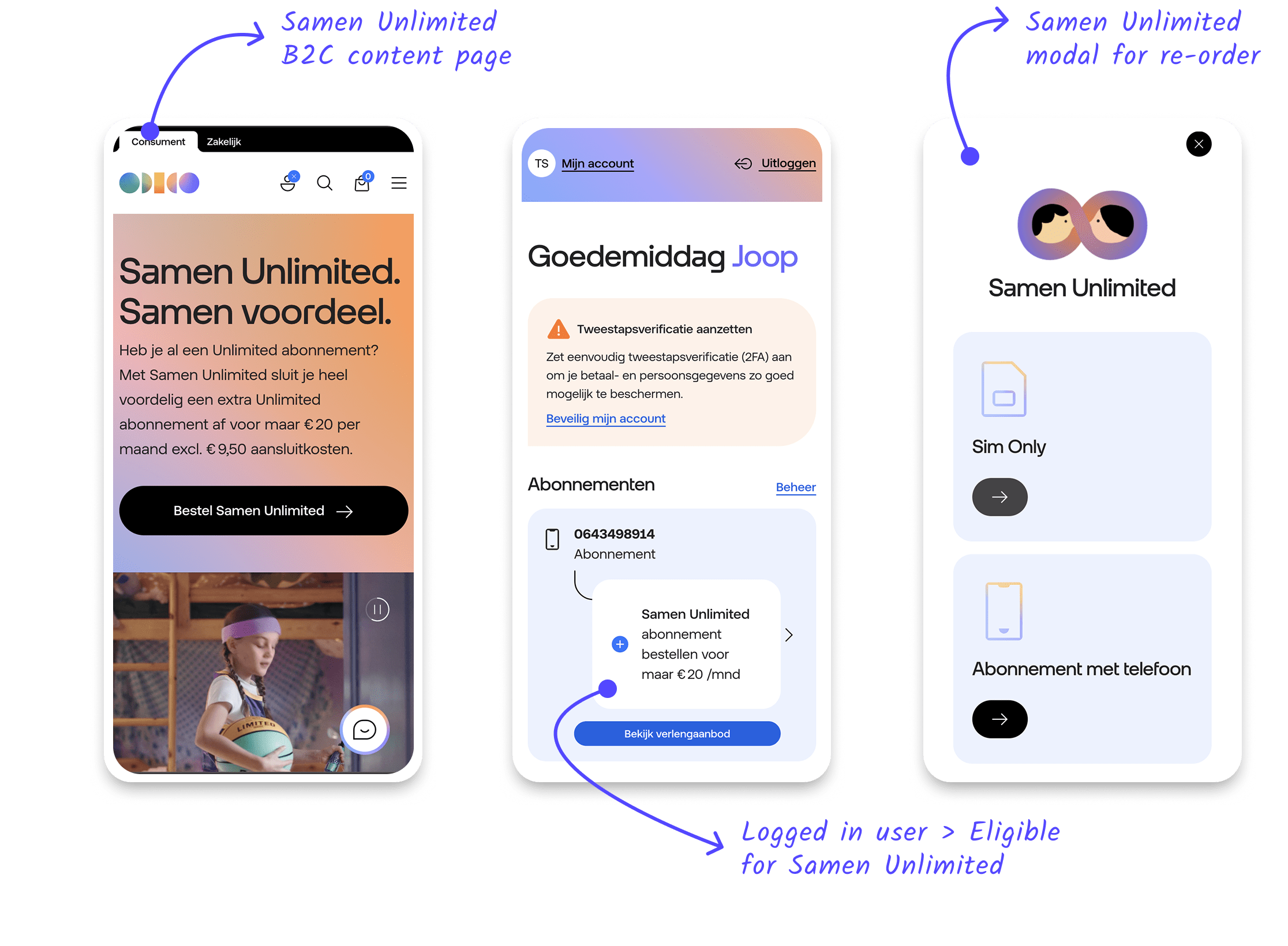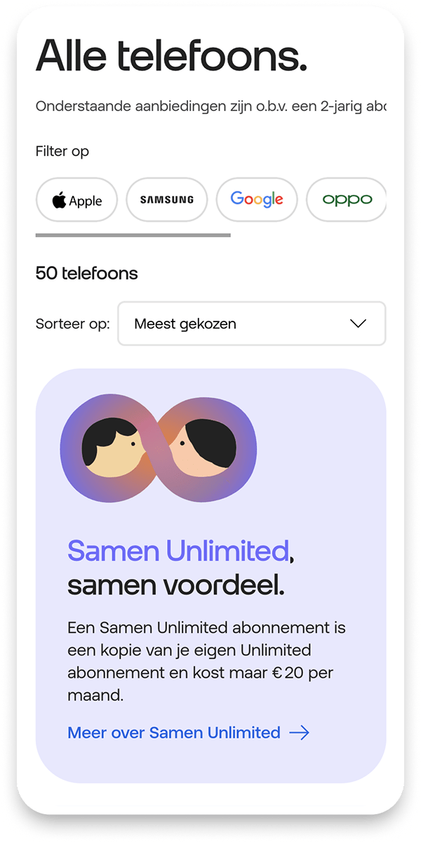 Develop and optimize a concept for ‘Samen Unlimited‘, a new proposition that seamlessly integrates with existing Hello Business B2C and B2B line-up within the current framework and user flow. The solution needed to be smooth, visually appealing, scalable, and easy for users to understand, clearly communicating the new proposition and its advantages to drive increased sales and conversions.
