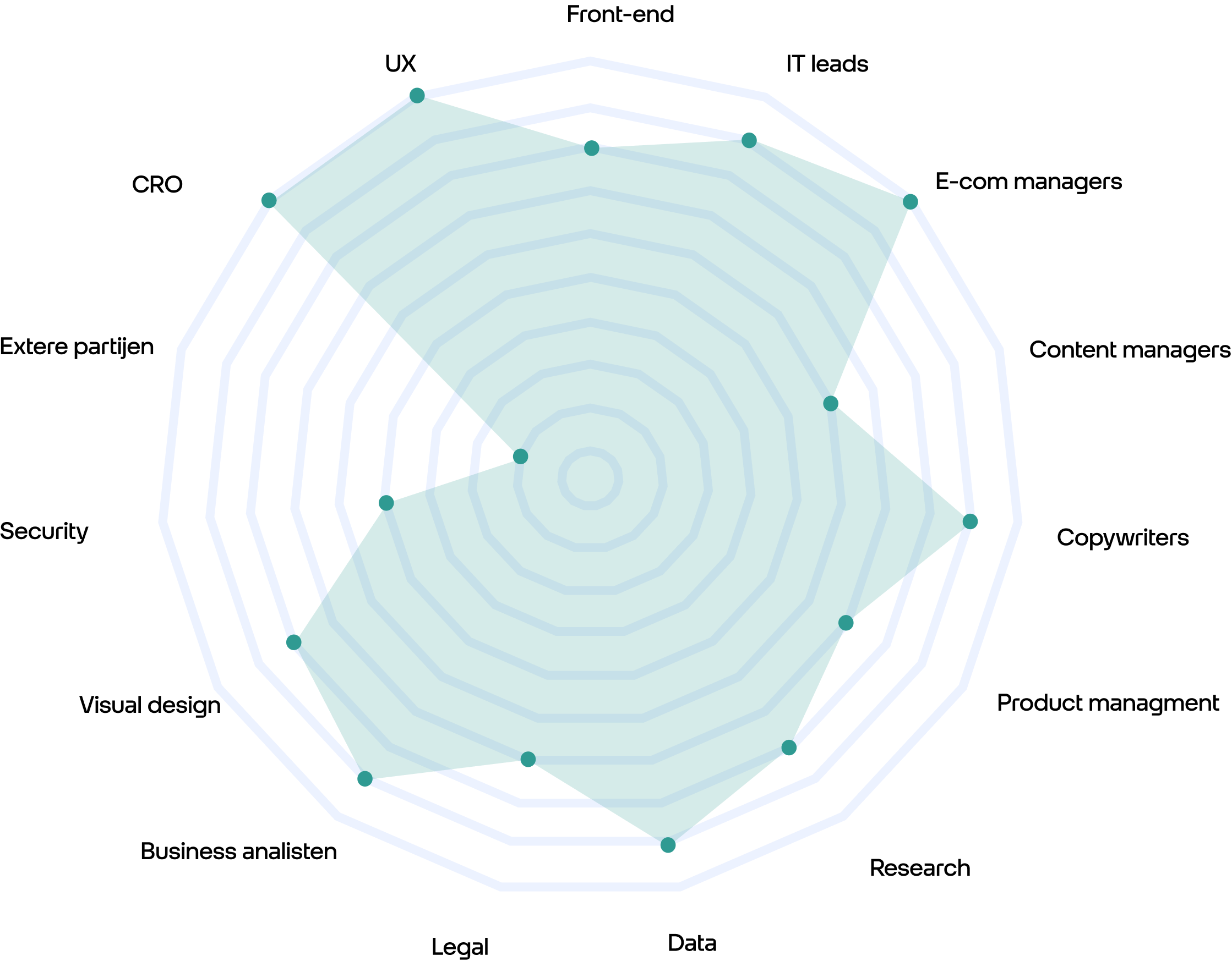 Collaboration is essential to delivering a strong end product. This radar chart provides a clear picture of how UX is represented within the organization on a complex project and how my collaboration plays out in a story with the different teams.