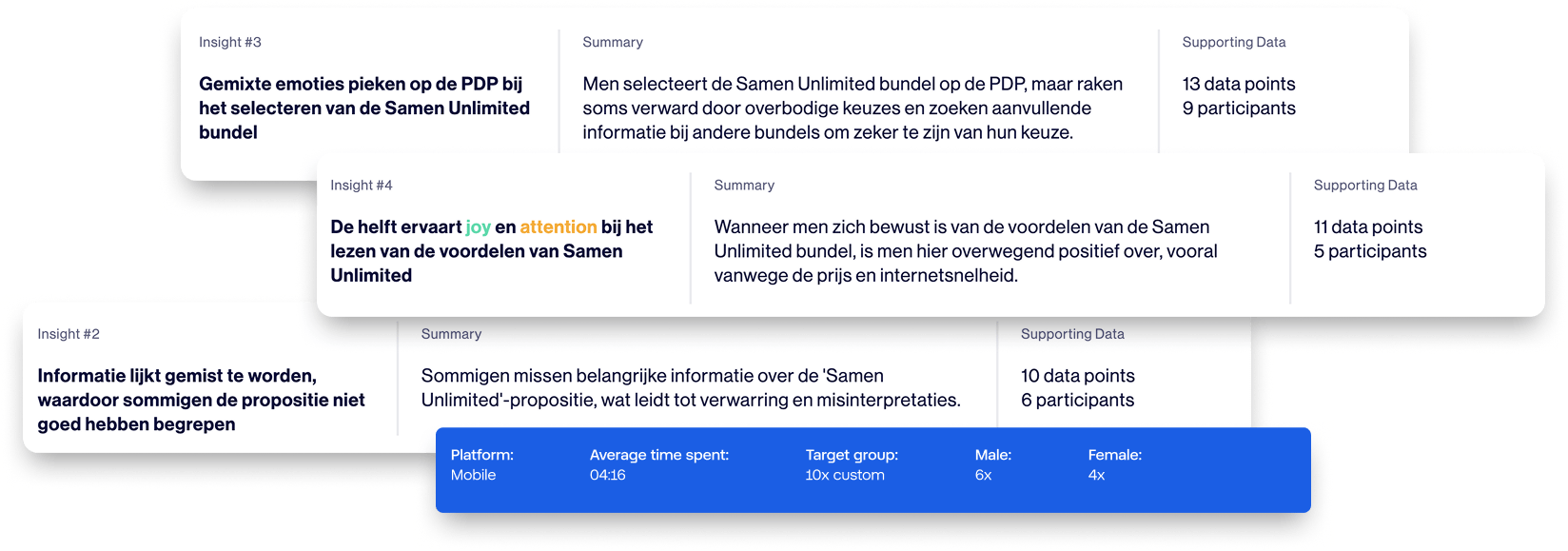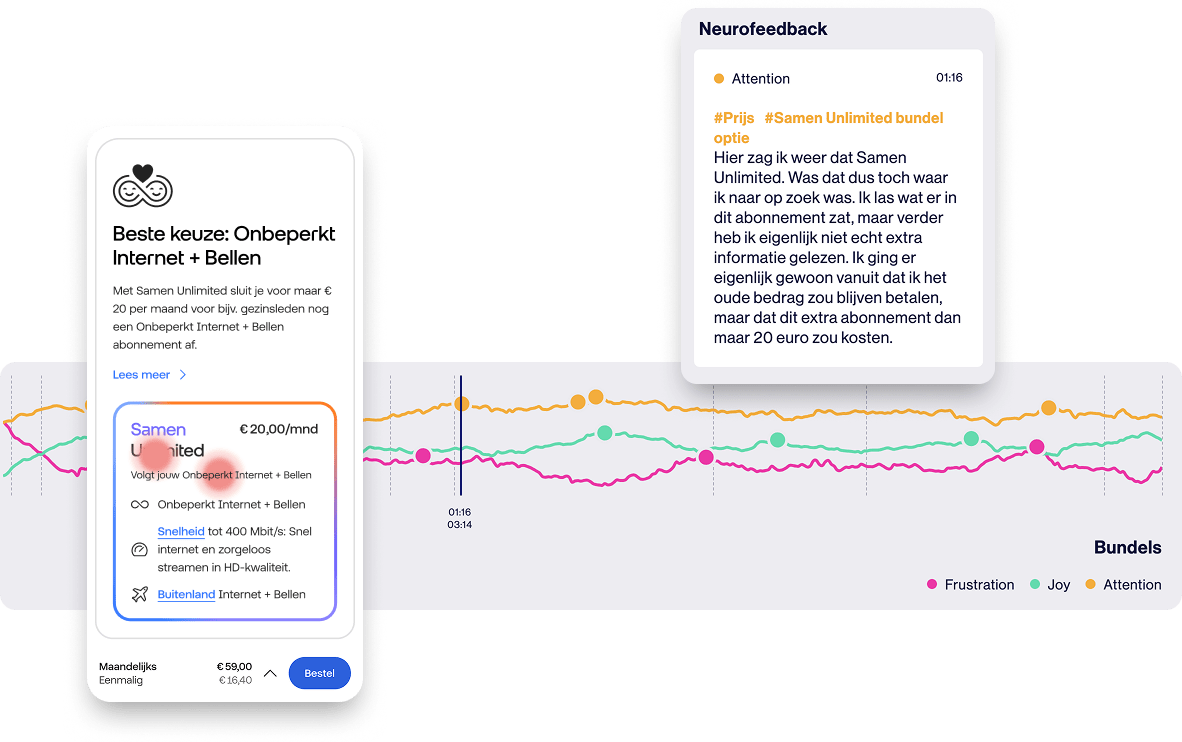 To ensure the Samen Unlimited proposition was attractive, easy to understand (UX/UI) and to pinpointing the subconscious bottlenecks in the user journeys, we conducted user testing in collaboration with Braingineers.
